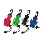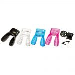 Cinchable stretch cord and plastic swivel clip. Available with colored Dura mouthpiece or clear silicone.