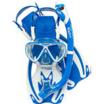 The Ultra-Comfortable Mask features a soft silicone skirt, wide fabric mask strap to prevent hair entanglement and easy to adjust buckles. The Snorkel features a dry top that prevents water from entering, silicone mouthpiece to prevent jaw fatigue and a purge valve to easily remove any residual water. The High Performance Fins feature an X-shape frame with thrust channels to provide power without muscle strain, and the adjustable silicone heel strap features soft, dimpled rubber that hugs the ankle without overbinding.