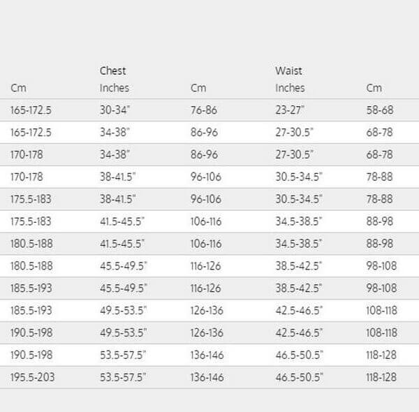 | Size | Height (cm) | Height (in) | Chest (cm) | Chest (in) | Waist (cm) | Waist (in) |