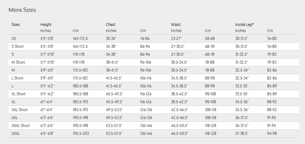 Fourth Element Men's Size Chart