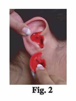 Fitting Doc’s Proplugs (DPP) is worded for the right ear:  Pick a DPP from Fitting Set that matches the size of the inner portion of the ear (Fig. 2).  Grasp the DPP with right finger tip in the cup of the right DPP and pinch it with right thumb at the lower curved part (Fig. 2). The arrow top (fin) of the DPP fits into the Crus Helix (Fig 3. #4). Twist with fingertip back and forth to make sure DPP is in tight between the Tragus (Fig 3. #1) and the Antehelix (Fig 3. #3). Do not jam rectangular knob into the right round canal.
