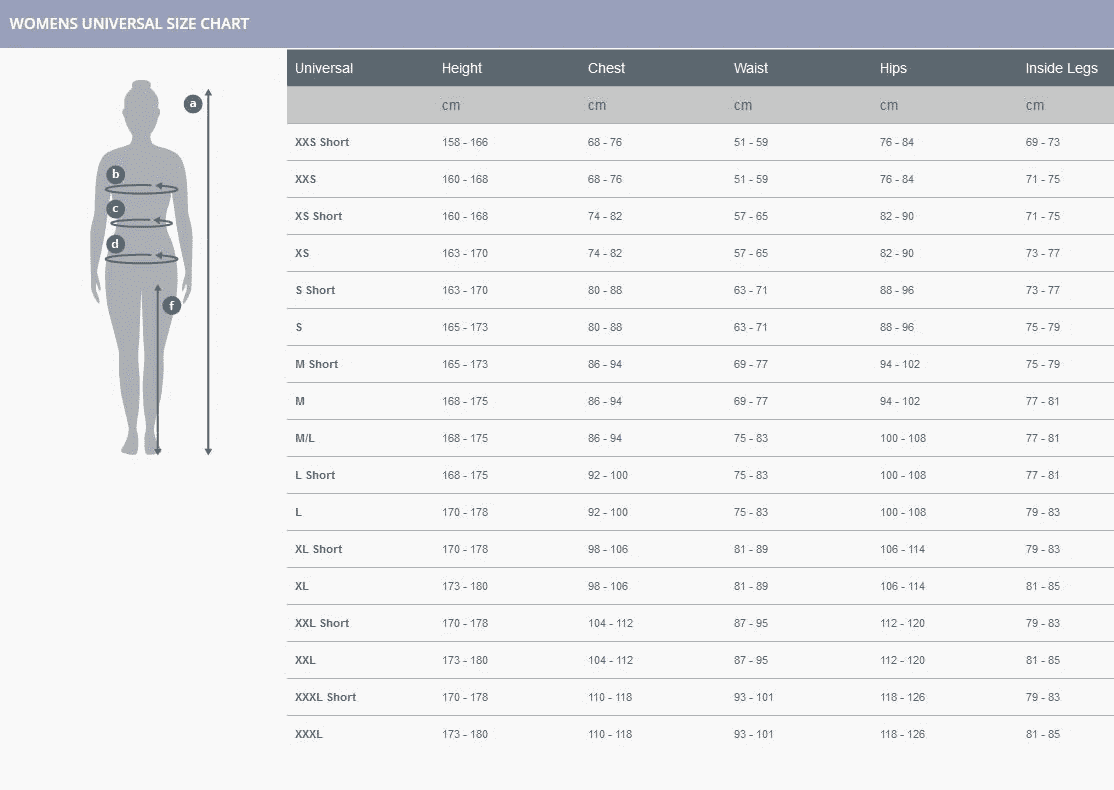 XS 162.5-170 5'4-5'7" 74-82 29-32.5" 57-65 22.5-25.5" 82-90 32.5-35.5"