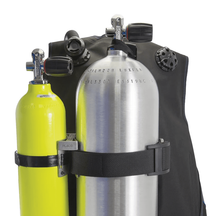 Mount on the diver’s right or left side