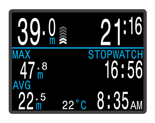 - Depth, time, resettable stop watch function