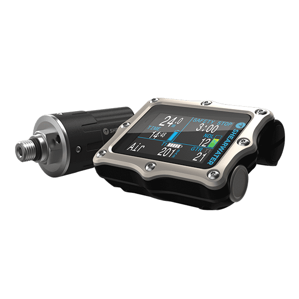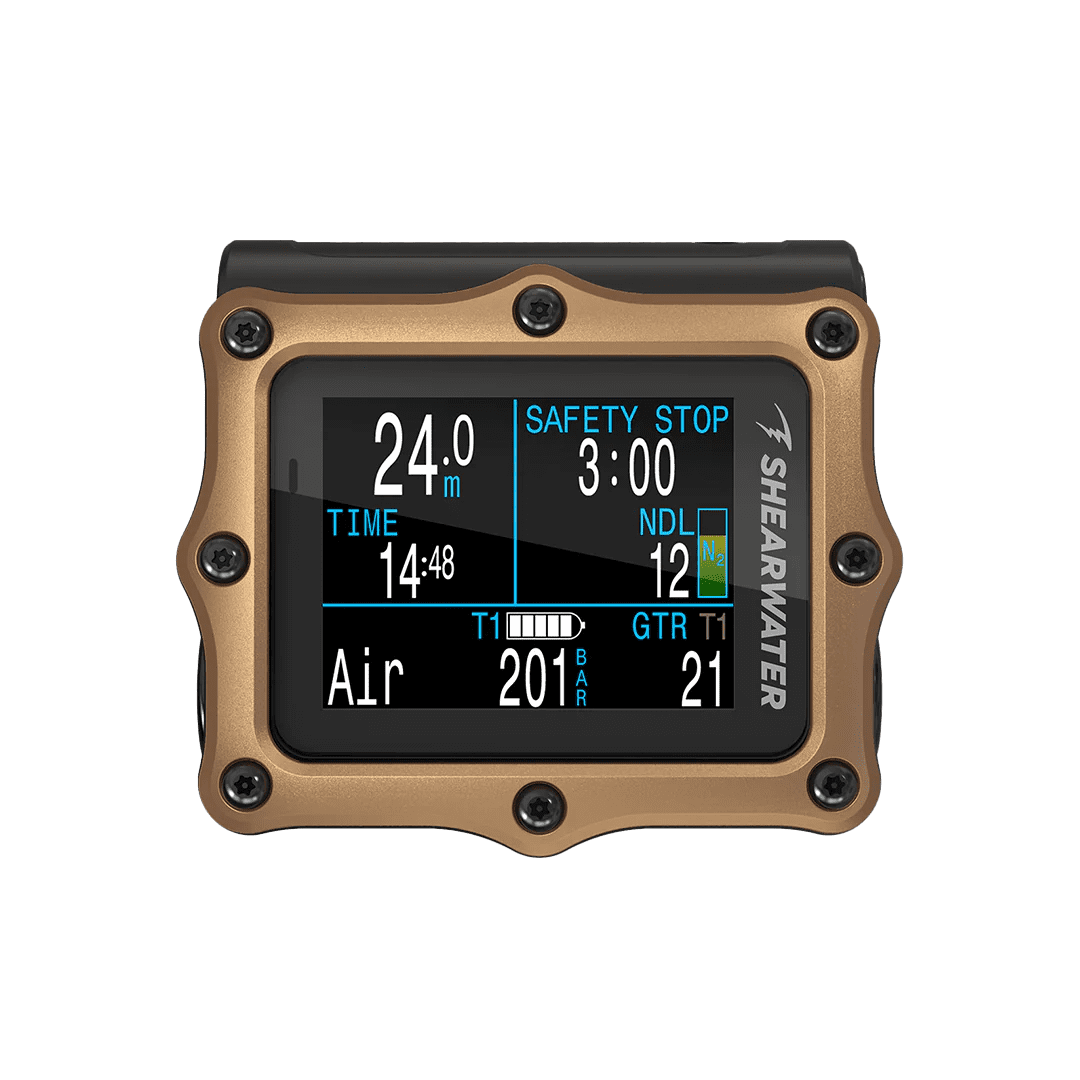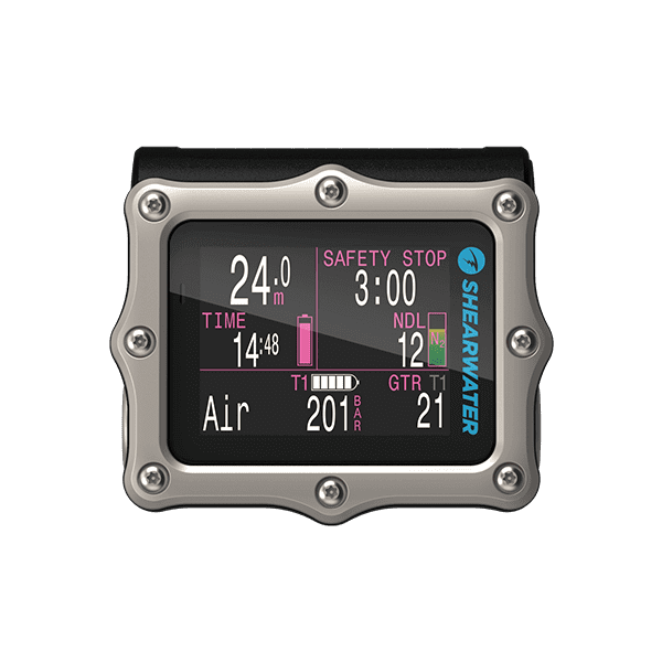 Air integration with up to four Shearwater transmitters allows room to grow from a first computer to a powerful, proven advanced technical diving solution. This is delivered using the trusted and easy to find user-changeable single AA battery and familiar ergonomic compact form factor.
