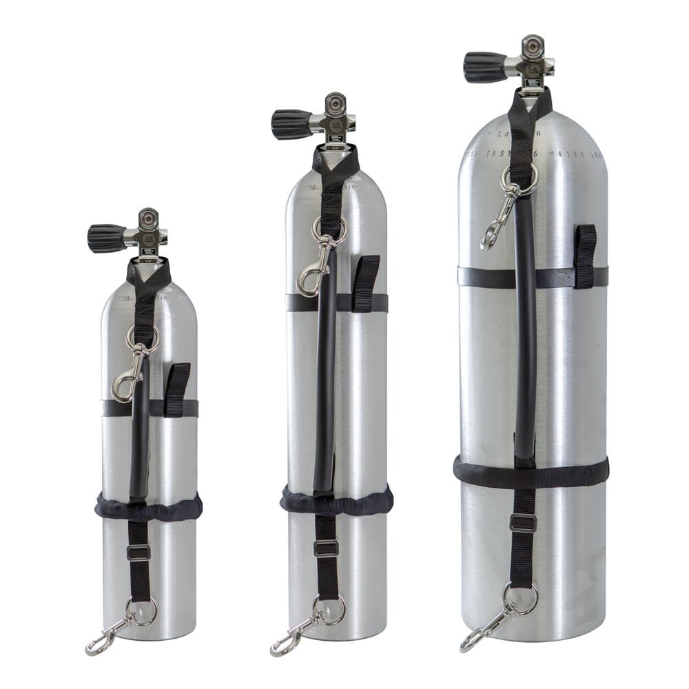 Our stage bottle kits come in three sizes to fit nearly all scuba cylinders. A 3-bar slide allows for length adjustment to cylinder size.