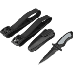 The Cressi Grip Blunt Tip Knife is a small-sized knife with a blunt tip and two different types of blades for multi-use. One side is an extra rigid serrated blade for sawing, the other side is a skillfully crafted straight blade. It features an ergonomic non-slip handle grip and a hole to add a lanyard (not included). The knife comes with a sheath that can be attached to the BCD shoulder strap or the inflator hose. The sheath has a locking mechanism that prevents the knife from falling out. Two Velcro BC mount straps (long 2 in | 5 cm) and a hose mount are included in the package.